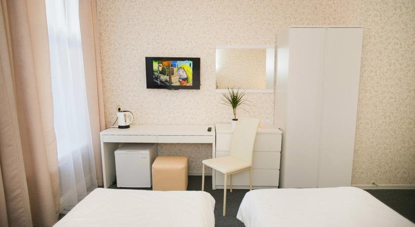 Двухместный номер с 2 отдельными кроватями, электрическим чайником, телевизором и холодильником. Из окон открывается вид на главную улицу города.